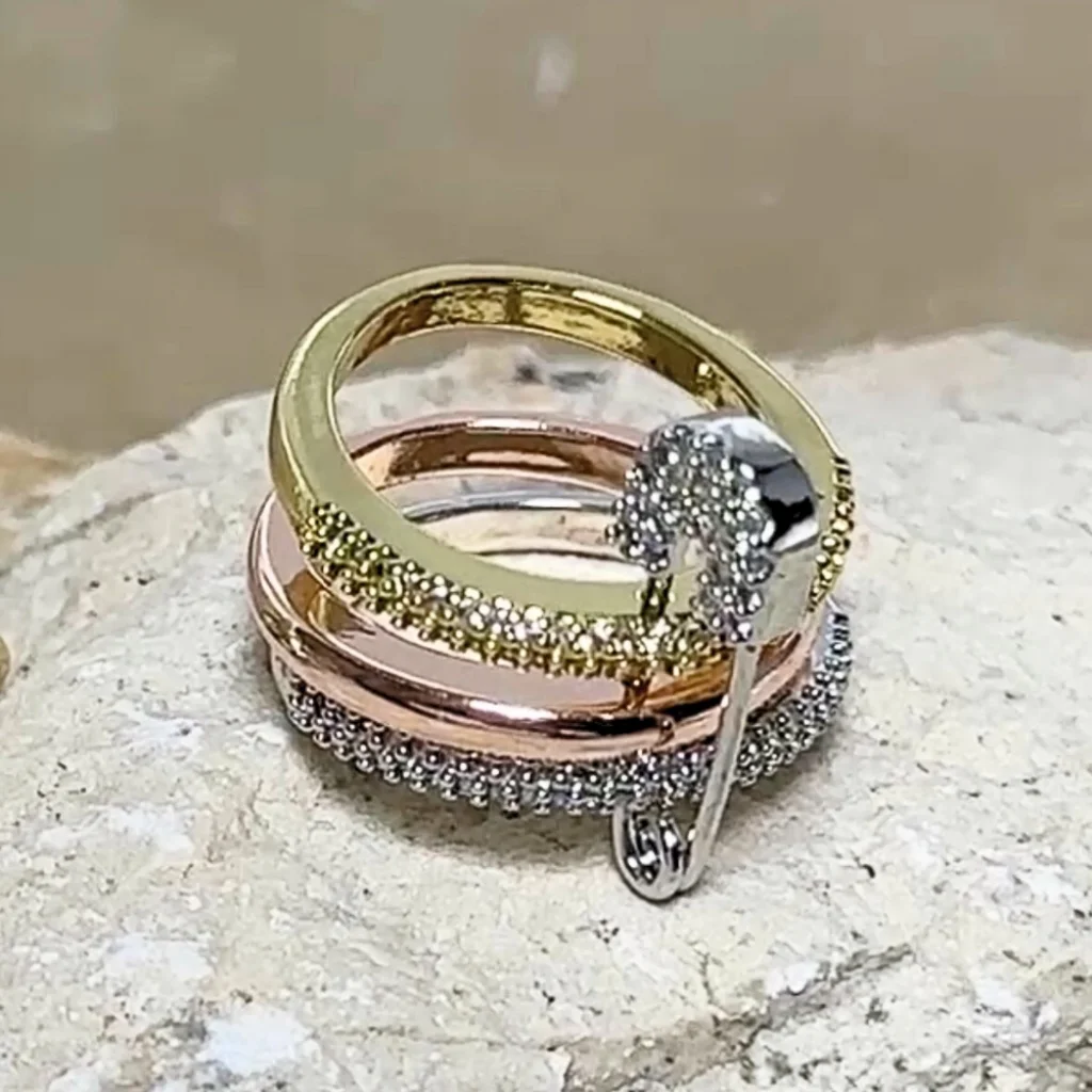 3'lü Silver-Gold-Rose Gold Taşlı Çengelli İğne Yüzük